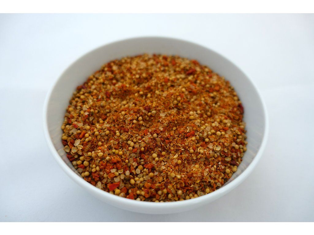 ZLOŽENIE: Soľ hrubozrnná 30 %, paprikové floky červené, HORČICA bílá, glutamát sodný, koriander, paprika sladká, čierne korenie drvené, rasca rímsky, cibuľa.