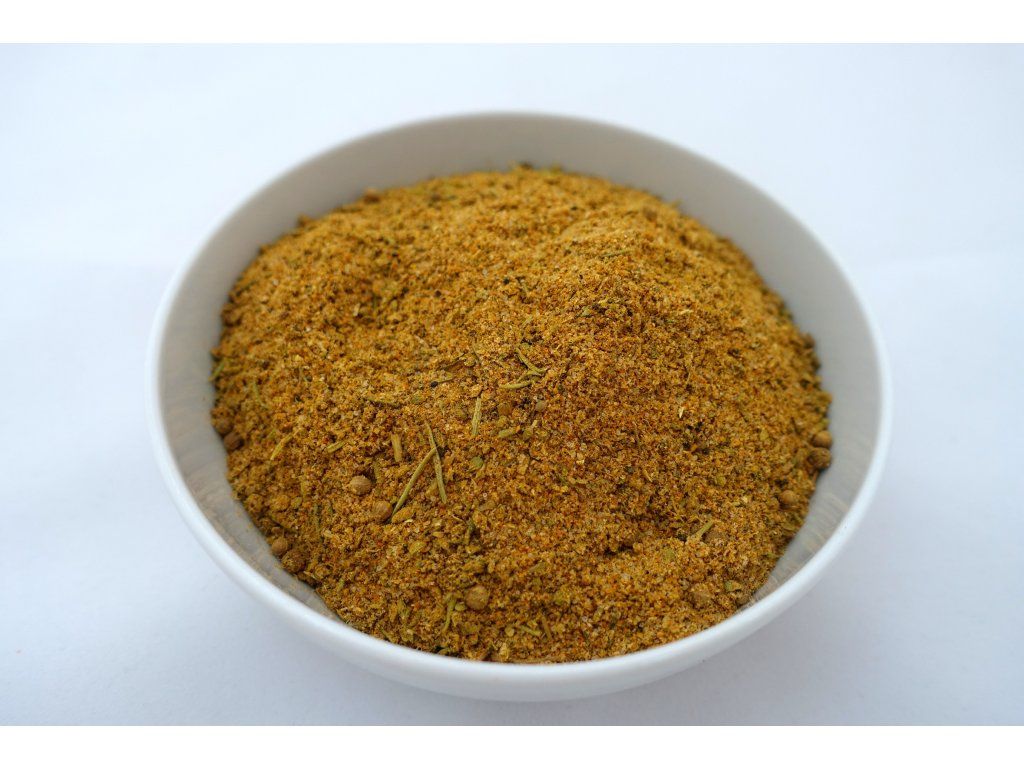ZLOŽENIE: Curry (koriander, kurkuma, senovka grécka, rasca rímsky, zázvor, klinček, fenikel, bobkový list, cesnak, škorica, soľ, čierne korenie, sušené mango, kukurica), soľ 20 %, E621, cibuľa, koriander, oregano, paprikový prášok, cesnak, rozmarín, saturejka, čierne korenie, kurkuma, muškátový oriešok.