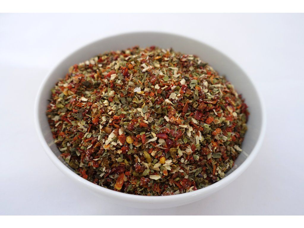 ZLOŽENIE: Paprikové floky červené, soľ max. 25 %, paprikové floky zelené, cesnak, cibuľa, oregano, bazalka, E621.