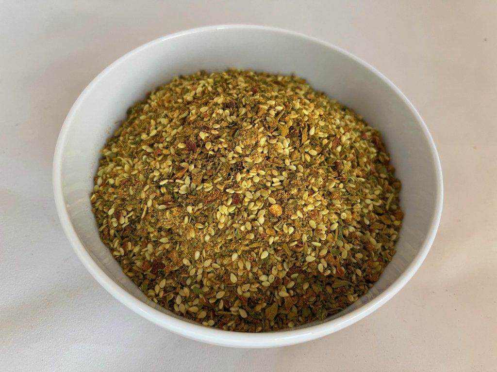 ZLOŽENIE: SEZAMOVÉ SEMÍNKO, curry mleté(koriander, kurkuma, senovka grécka, rasca, zázvor, klinček, fenikel, bobkový list, cesnak, HORČICA, chilli, škorica, soľ, čierne korenie, sušené mango, kukurica), paprikové floky červené, látka zvýrazňující chuť a vôňu:E621, tymián celý, oregano, rozmarín drvený, kurkuma mletá, petržlenová vňať