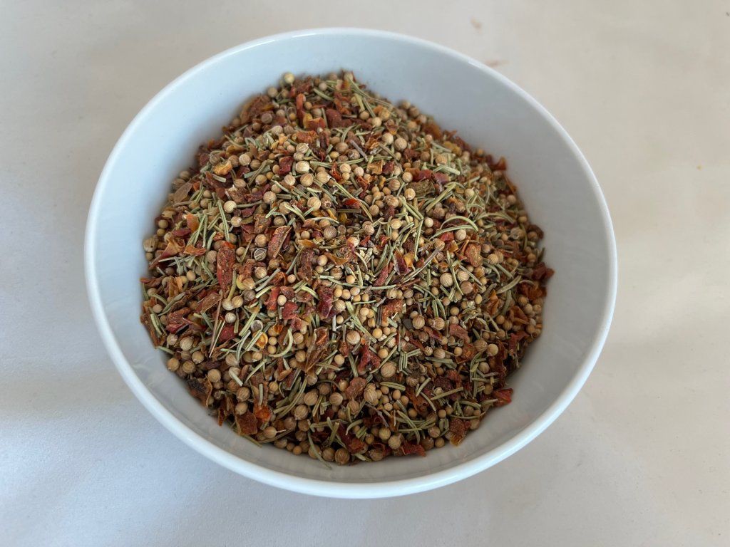 ZLOŽENIE: paprikové floky červené 2x2, koriander celý, HORČICA bílá celá, rozmarín celý, čierne korenie drť