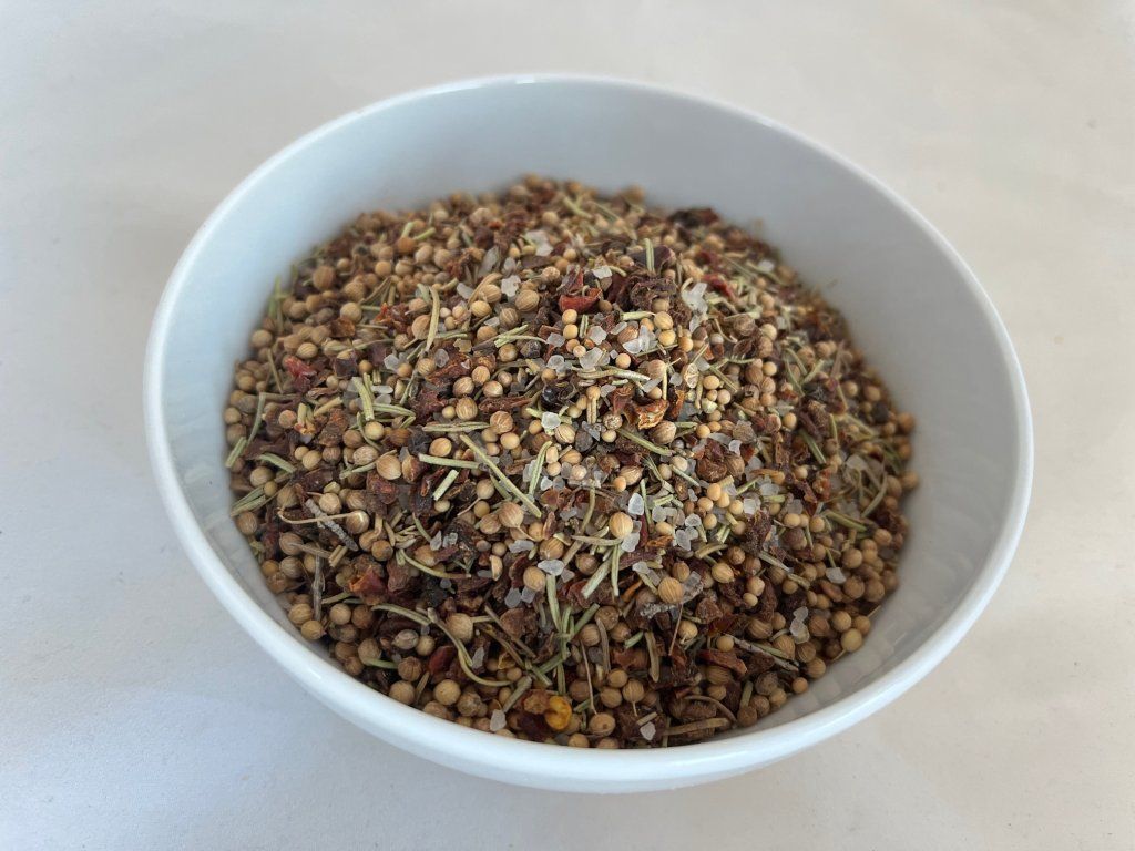 ZLOŽENIE: soľ hrubozrnná 30 %, paprikové floky červené, koriander, HORČICA bílá, rozmarín, čierne korenie