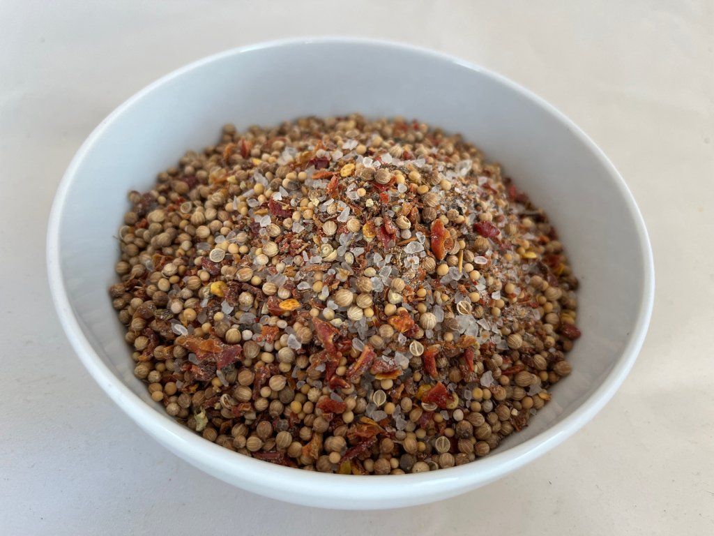 ZLOŽENIE: soľ hrubozrnná 30 %, paprikové floky červené, HORČICA bílá, koriander, čierne korenie, glutamát sodný