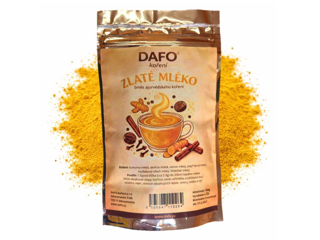 Hľadáte prirodzený spôsob, ako zahriať organizmus a podporiť vitalitu?Zlaté mlieko od českej značky DAFOje starostlivo zostavená zmes aromatického korenia inšpirovaná tisícročnou tradíciou ajurvédy. Tento zlatožlutý nápoj, známy aj ako „Haldi Doodh“, je obľúbený pre svoju harmonickú chuť a príjemne hrejivý charakter.