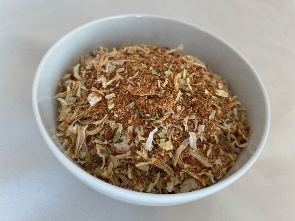 ZLOŽENIE: Cibuľa plátková, cesnak, chilli plátky, paradajkový prášok, soľ 5 %, pór.